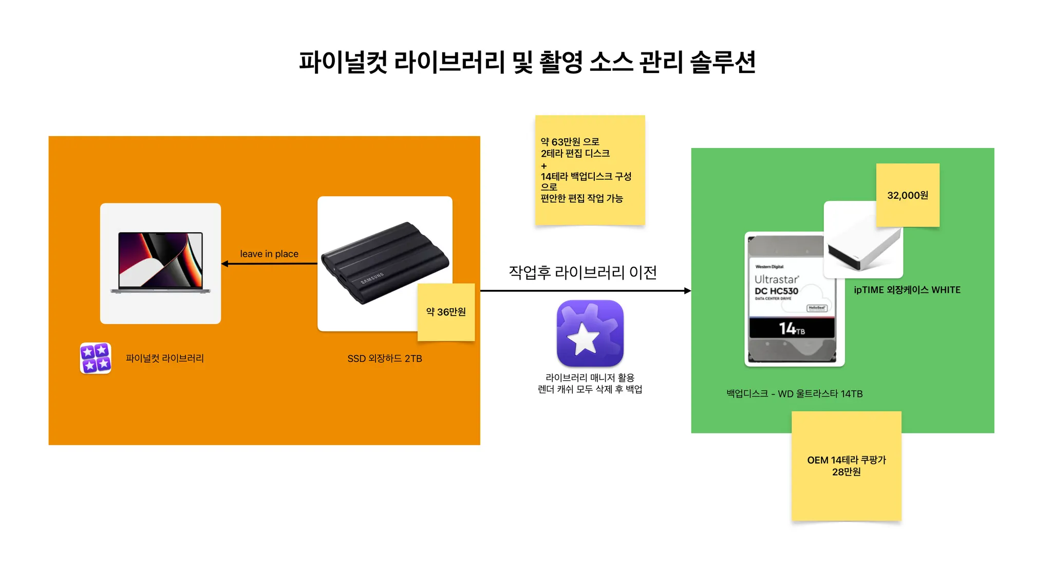 위의 2024년 10월 기준 가격이다. 가격은 지속적으로 변동됨으로 시스템만 이해하길 바란다. 하지만 대략 60~70만원으로 2TB 편집 활성 디스크, 14테라 백업 디스크 구성이 가능하다.
