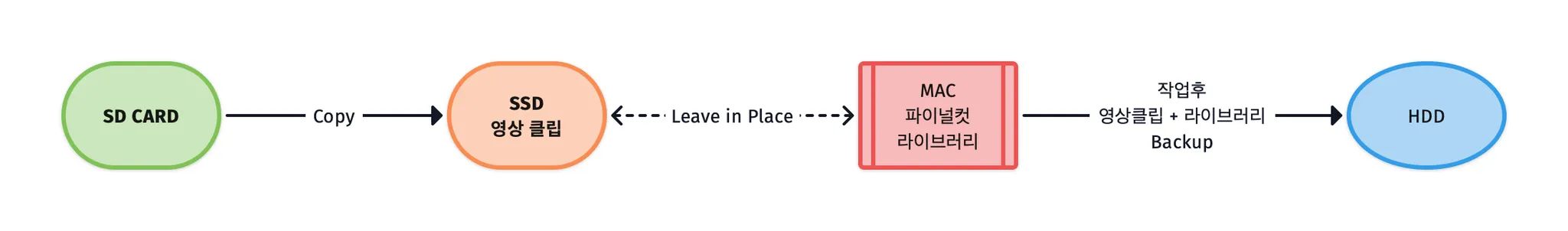 여기서 HDD 까지 자료를 보관한다는 의미는 촬영한 영상클립, 파이널컷의 라이브러리를 함께 보관한다. 작업이 끝난 라이브러리를 바로 삭제하는 분들도 많지만 추천하지 않는다. 우리의 인생의 소중한 시간을 장작삼아 불태워 만든 영상제작물을 그냥 지운다고? 우선은 보관하길 바라며 지우는 시기를 조금이라도 늦추길 바란다.