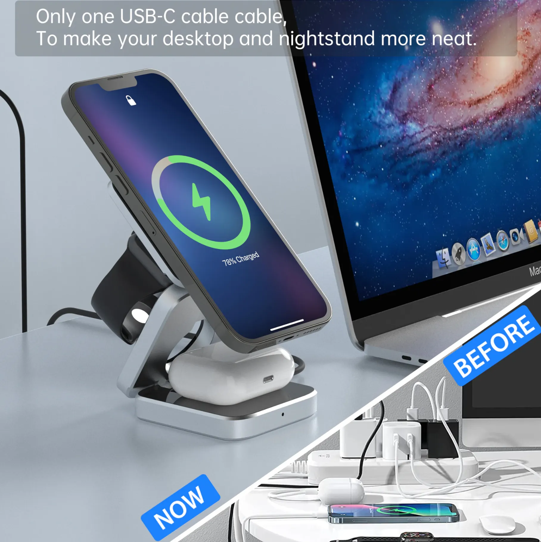 고속충전은 아니지만 3개의 기기를 밤사이에 케이블 하나로 무선으로 충전기 가능하기에 전체효율을 더 뛰어납니다.