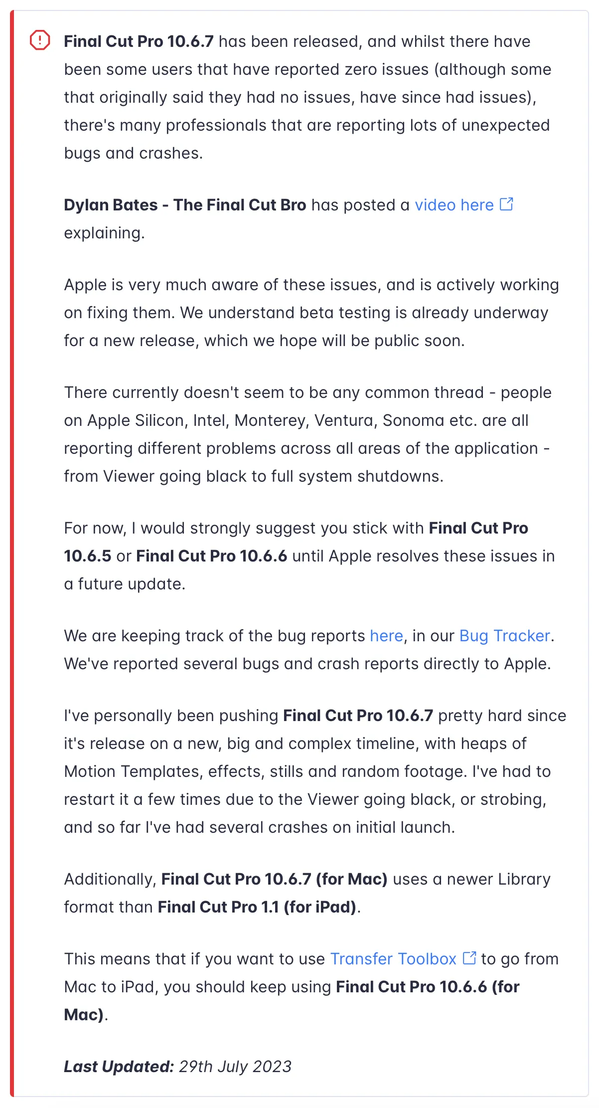 파이널 컷 프로 10.6.7가 출시되었습니다. 일부 사용자는 문제가 없다고 보고했지만(문제가 없다고 말했다가 나중에 문제가 생긴 사용자도 있음), 많은 전문가들이 예기치 않은 버그와 충돌을 보고하고 있습니다.