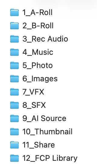 파이널컷 영상 제작 전에 미디어 폴더를 다음과 같이 자동생성해 줍니다.