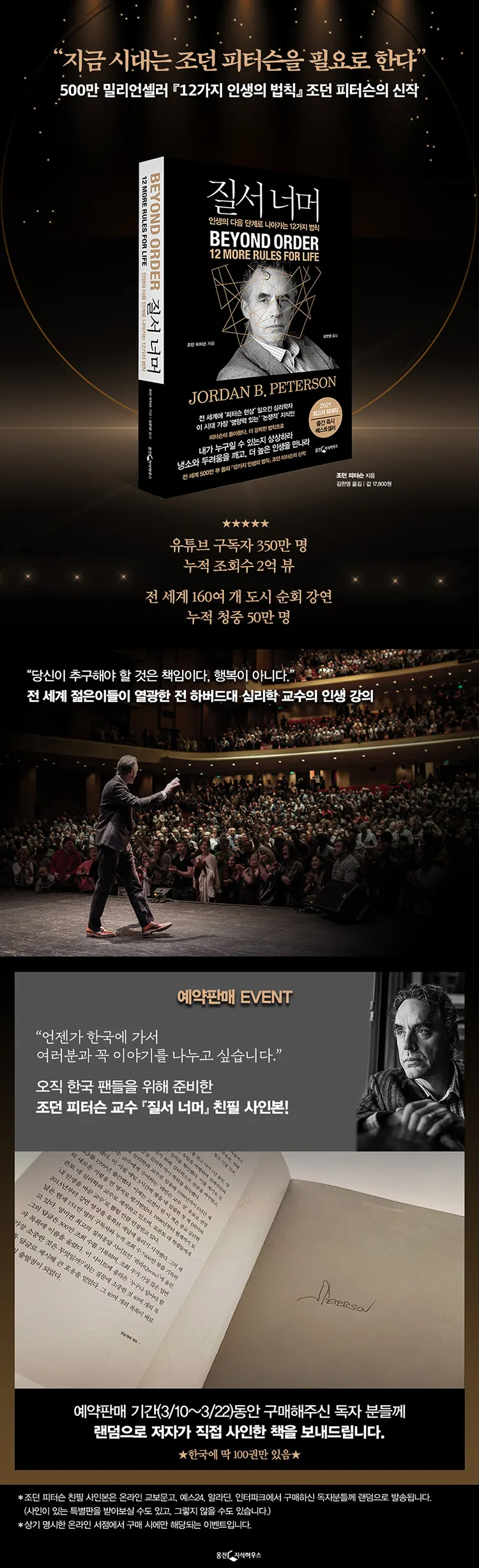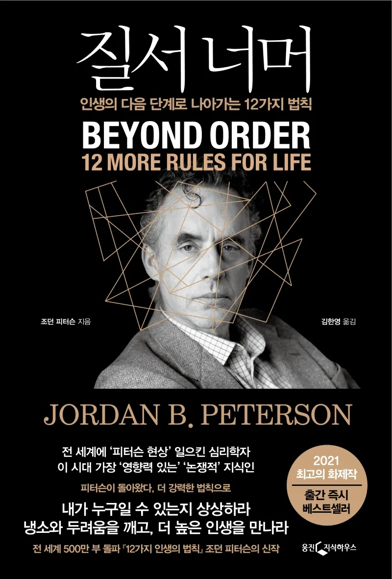 북미와 유럽 125개 이상 도시들에서 순회한 강연은 연일 매진이었다. 피터슨의 유튜브 공식 채널 누적 조회수는 2억 뷰에 달한다. 전 세계 언론이 앞다퉈 그를 다뤘다. 그는 ‘지적 영웅’ ‘시대의 대변자’ ‘인터넷 아버지’로 떠올랐고, 세계에서 가장 ‘인기 있고’ ‘논쟁적이고’ ‘영향력 있는’ 지식인으로 부상했다. 그러던 어느 날 그가 돌연 모습을 감췄다. 후속작을 집필하던 중 갑작스레 부인의 말기 암 진단과 그 자신의 심각한 건강 문제(약물 부작용 치료로 인한 코마 상태에서 폐렴까지)가 연이어 닥쳤다. 1년 가까이 병상에서 생사를 오간 그는 재활센터에서 걷는 법, 눕는 법을 다시 배워야 할 정도로 심신이 피폐해졌을 때 ‘거의’ 모든 것을 포기할 뻔했다고 솔직하게 고백한다. 하지만 갑자기 인생을 덮친 혼돈에 굴복하는 대신 자신의 신념과 철학을 담금질하는 계기로 삼았고, 보다 깊고 확장된 사유를 펼쳐 보이며 ‘인생 법칙’의 완결판 『질서 너머』로 돌아왔다. 왜 ‘질서 너머’ 인가? 당신은 자신이 누구일 수 있는지, 최고의 모습을 상상하고 추구해야 마땅하다(법칙2). 그것이 진짜 인생이니까. 질서는 혼돈의 해독제가 될 수 있지만 완벽하지 않다.