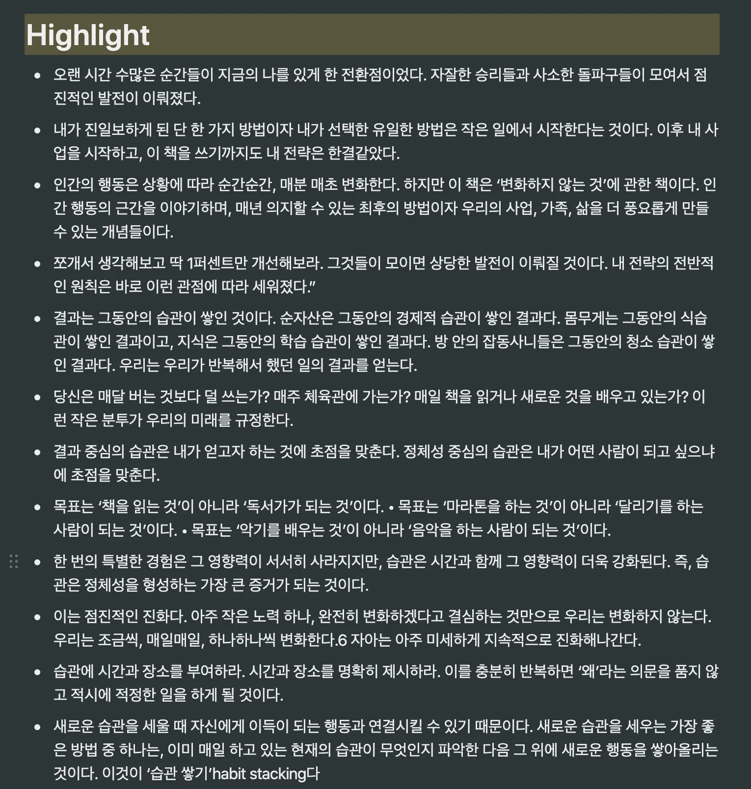 이미 읽었던 책을 다시 펼쳐가며 밑줄 그은 것들을 수기로 노트에 적거나 타이핑 한다는 것은 아주 고된 일이다. 하지만 학습효과는 아주 높을 것이다. 그렇지만 정리하는 것 자체의 시간을 줄이고 오히려 하일라이트를 단번에 정리 하고 그에 대한 자신만의 감상이나 적용점들을 생각해볼 시간들을 가진다면 어떨까? 요즘 처럼 책이든 스크린이든 많은 정보를 수집하게 되는 시대에는 그에 맞는 가공법이 또한 필요하다.