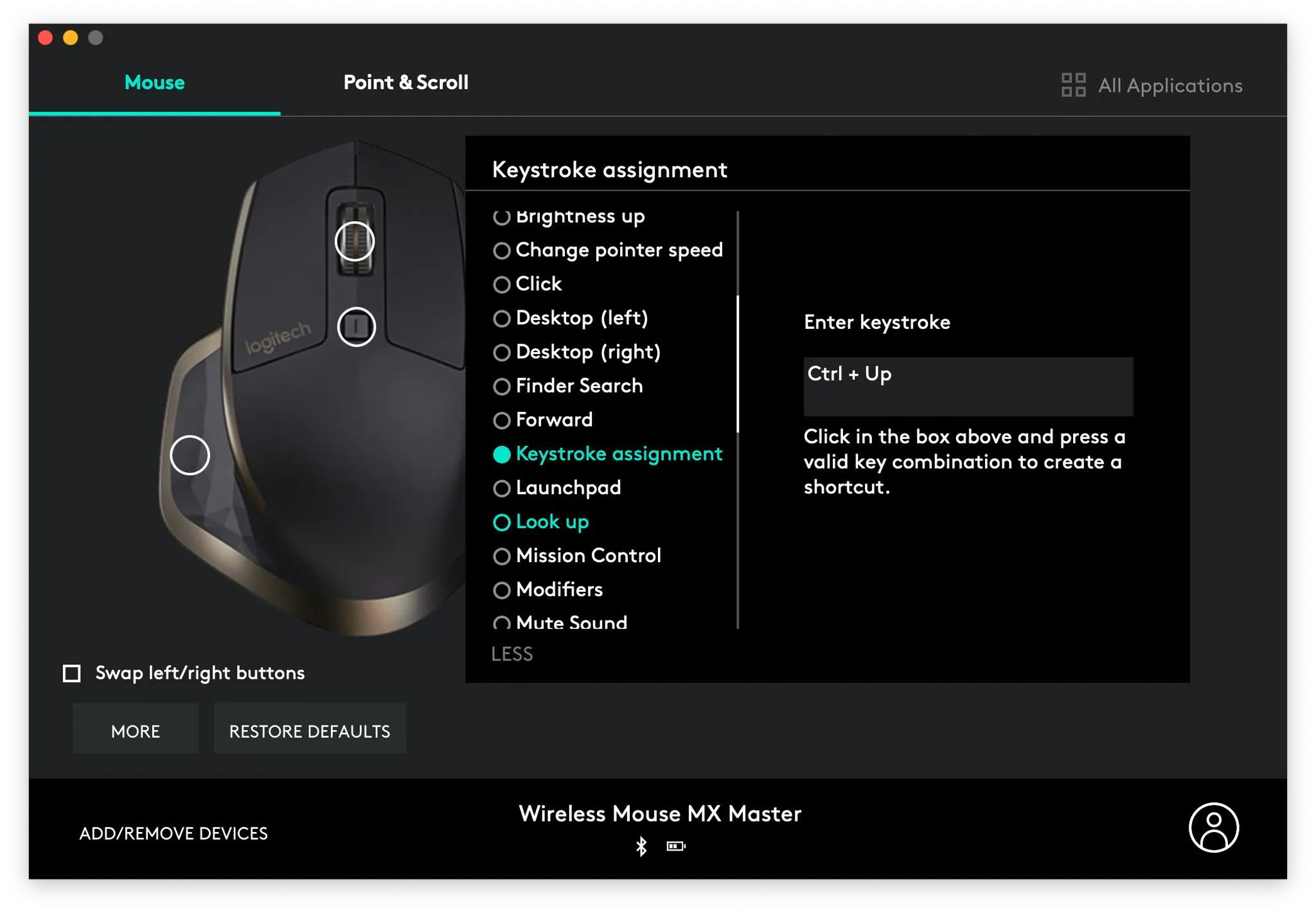 logi 앱에서 keystorke assignment를 Ctrl+up(화살표 위)로 설정한다.
