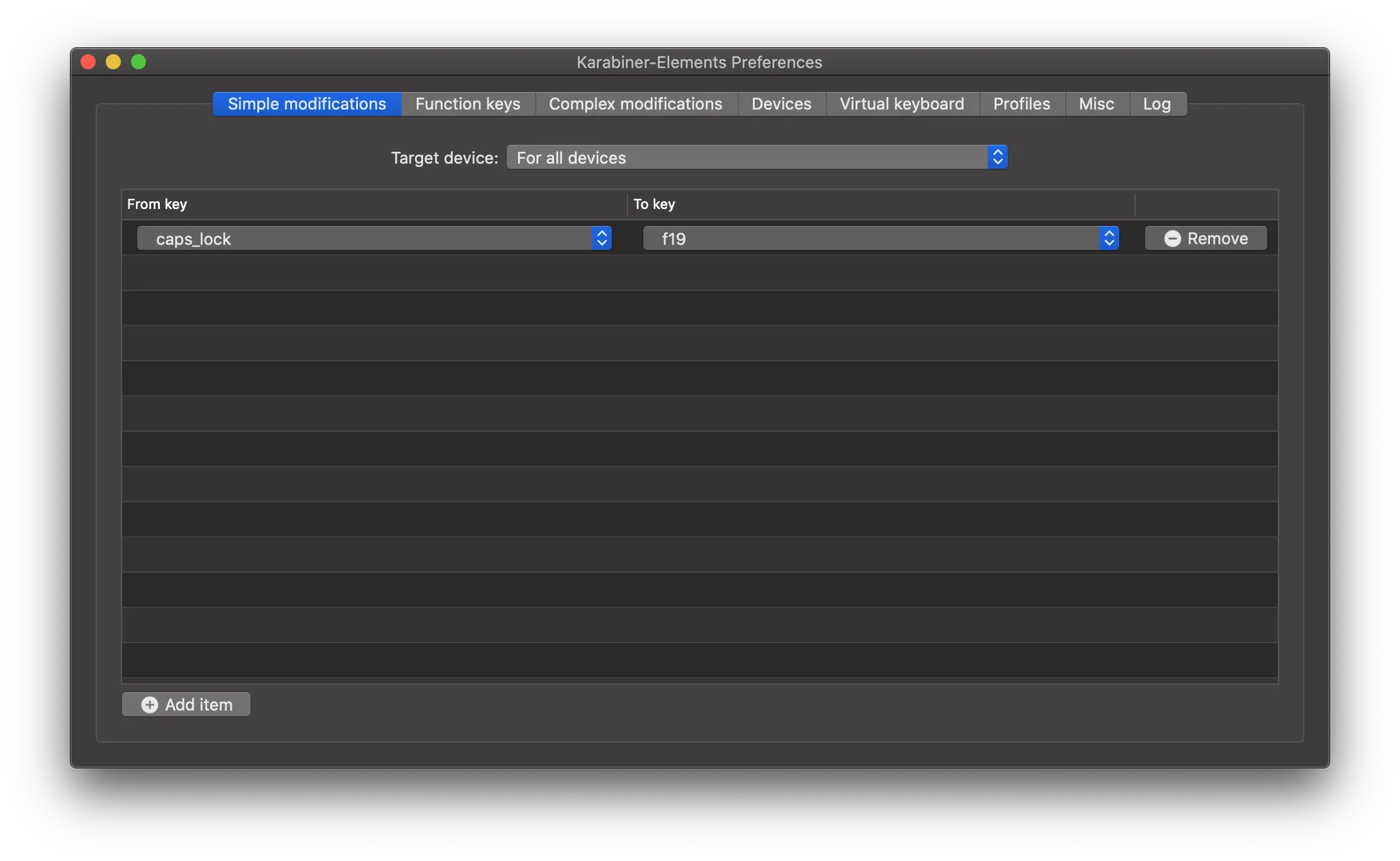 이렇게 하면 CapsLock 키를 f19 로 맵핑을 해주게 된 것입니다.