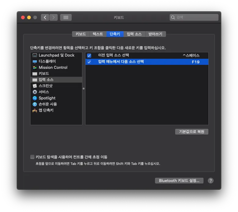 입력 메뉴에서 다음소스 선택 키를 누른다음 CapsLock 을 한번 눌러주면 F19 가 입력이 됩니다.