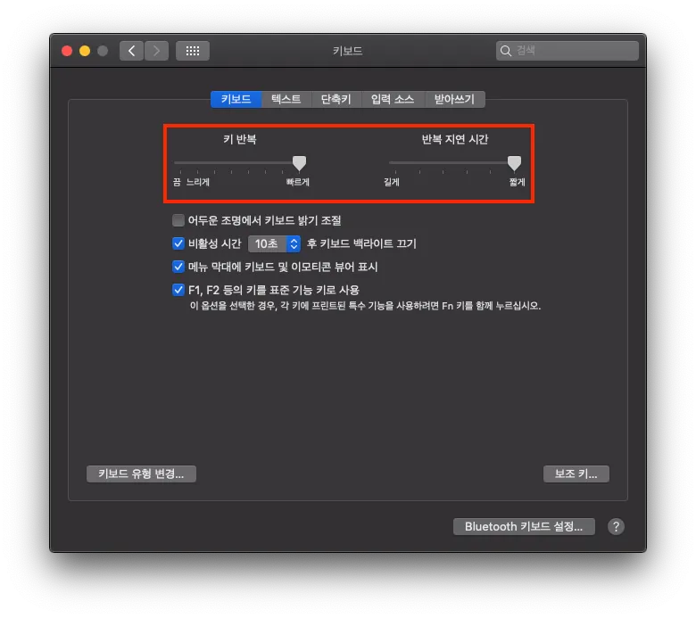 좀 더 빠르고 경쾌한 타이핑을 원하면 아래와 같이 키반복과 반복지연을 짧게 해주시면 입력과 삭제가 더 빨리 됩니다. 자신의 타이핑 스타일에 맞게 변경해 보시면서 사용하세요.