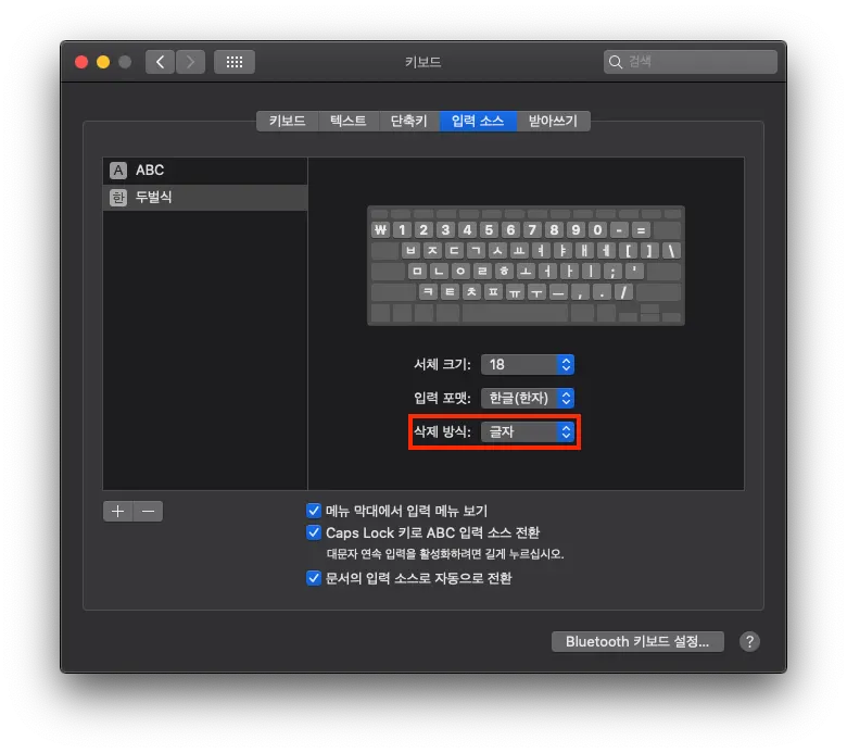 이건 개인취향인데 저는 오타가 생겼을 경우 삭제를 진행할 때 자소 단위로 삭제가 되는데 이게 오히려 키를 더 많이 입력 하게 되는 것 같아 저는 글자 단위로 변경해서 사용하고 있습니다. 이것도 개인에 맞게 설정하시면 좋습니다만 단어 단위로 삭제 되니 오타를 수정해 나가는 것보다 새롭게 쓰는 것이 시간을 단축하는 것 같아서 이렇게 해놓고 사용하고 있습니다.