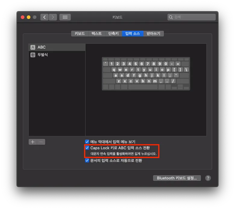 CapsLock 으로 한/영 전환을 하려면 키보드/입력소스 하단 두번째 메뉴를 체크해 주어야 합니다.