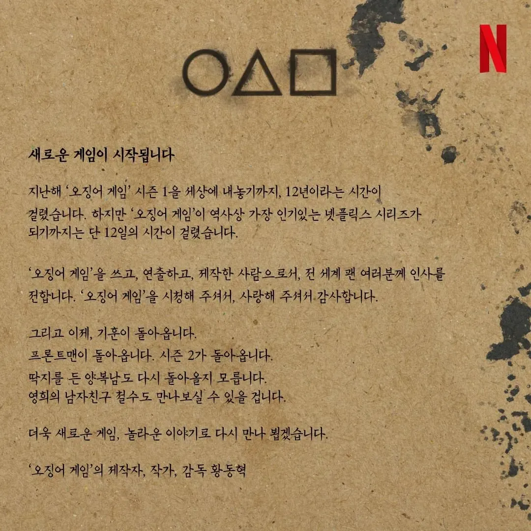 '오징어 게임'을 쓰고, 연출하고, 제작한 사람으로서, 전 세계 팬 여러분께 인사를 전합니다.