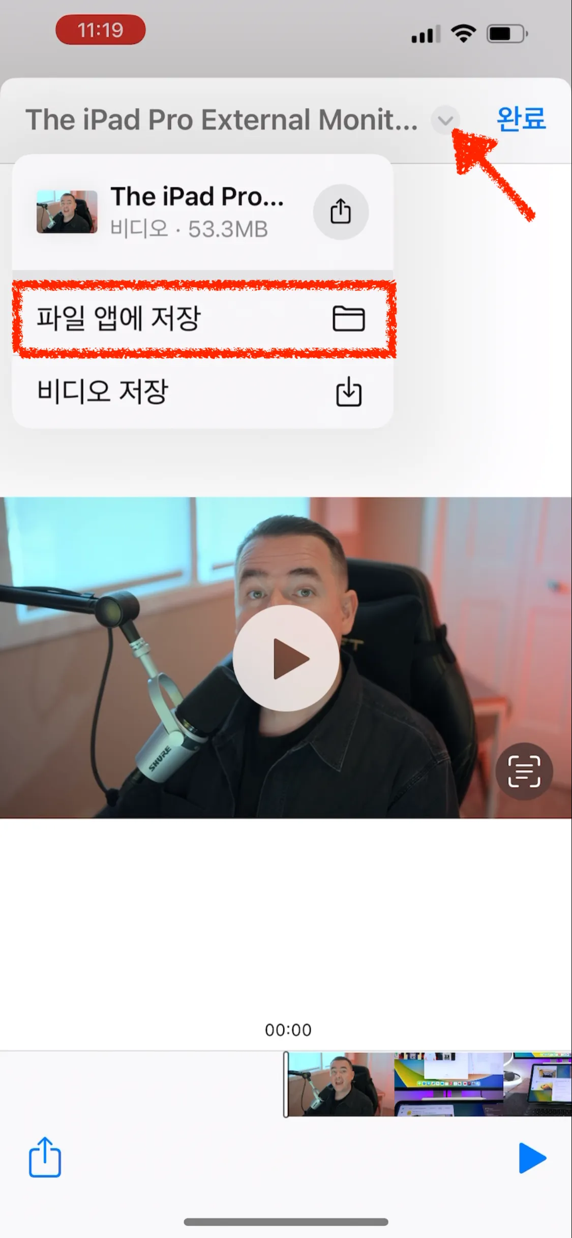화살표 파일 이름 끝부분을 눌러서 저장 위치를 파일 앱에 저장 → 아이패드에 폴더 하나 만드셔셔 저장해주세요.