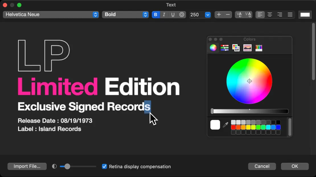 Customize font, style, color, kerning and alignment through a familiar inteface. Import RTF files.