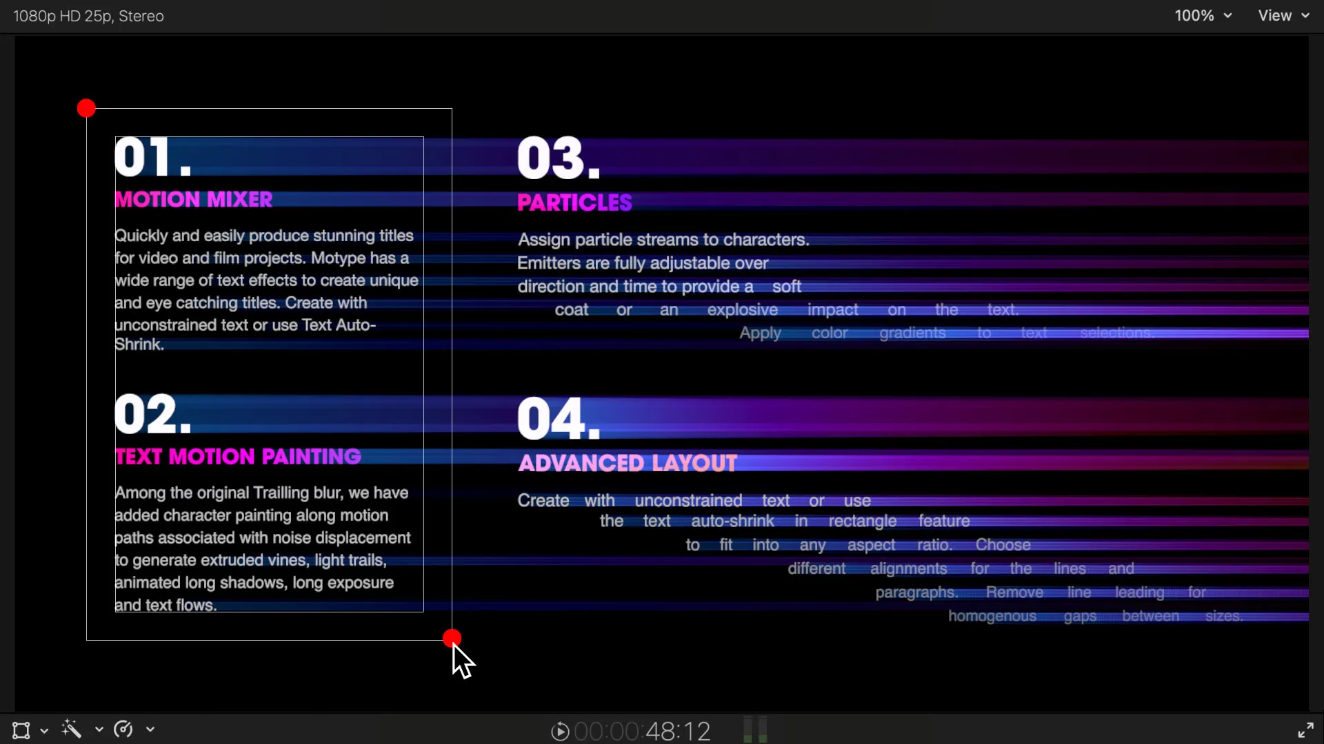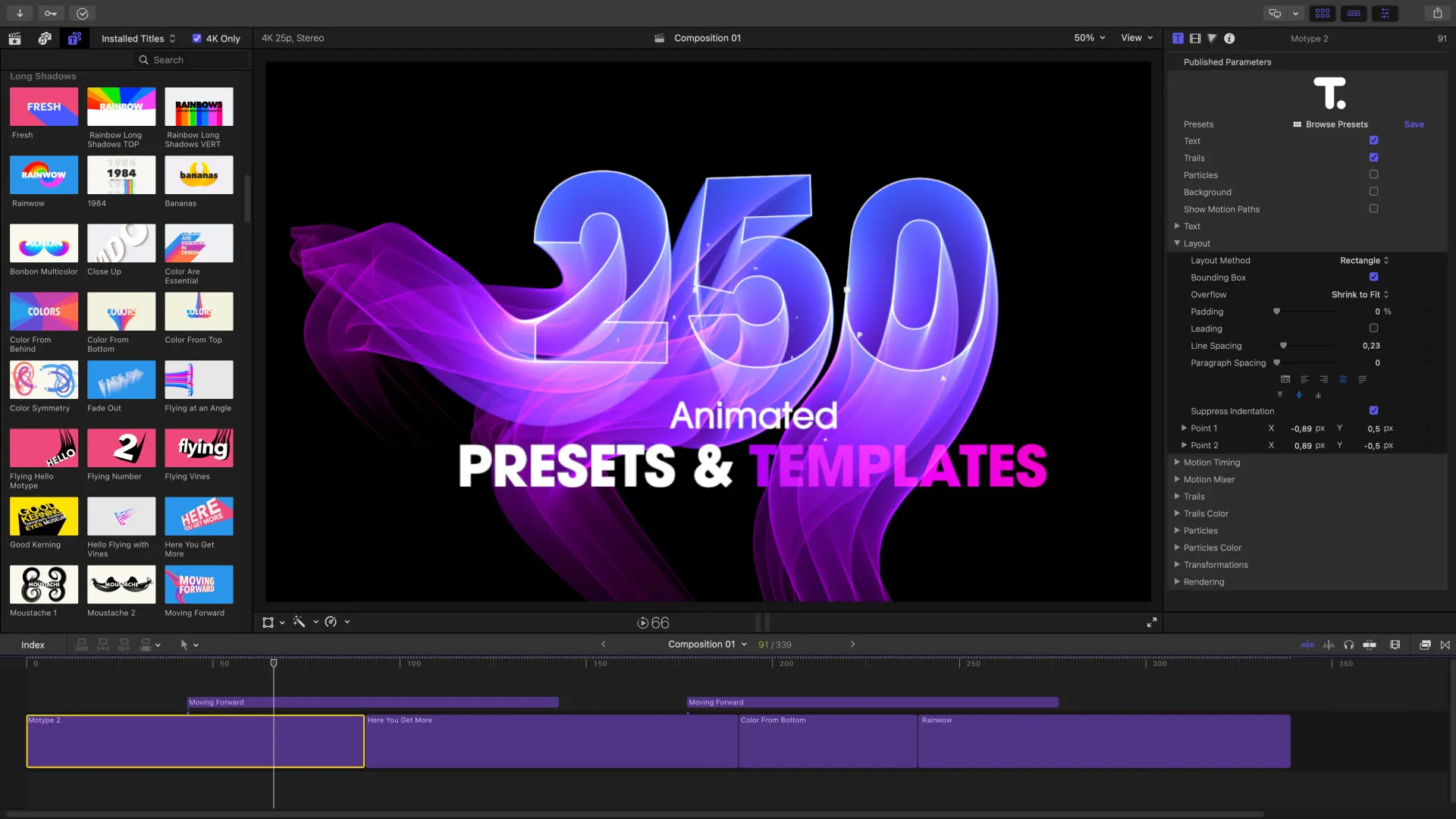 Motype 2 is a major update of our popular motion titles plugin built from the ground up on top Apple's best Technologies, including Metal Graphic Acceleration and Core Text for high performance Typographic Layout.