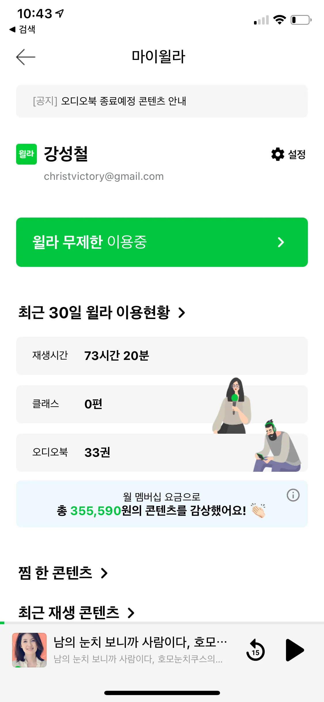 2021년 부터는 오디오북 윌라를 통해서 오디오북과 클래스(강연)을 듣고 있다. 나와 아내 그리고 자녀들 까지 총 5명이 모두 이용하는 서비스이다. 특히 키즈 콘텐츠가 정말 많아서 너무 만족하고 있다.