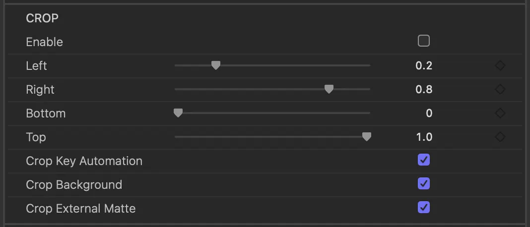 Crop Quickly create a garbage matte and speed up rendering with complex keys. Crop doesn’t apply a matte at the end of the chain, it defines the pixels that are processed from the beginning of the chain, for both image and matte operations.