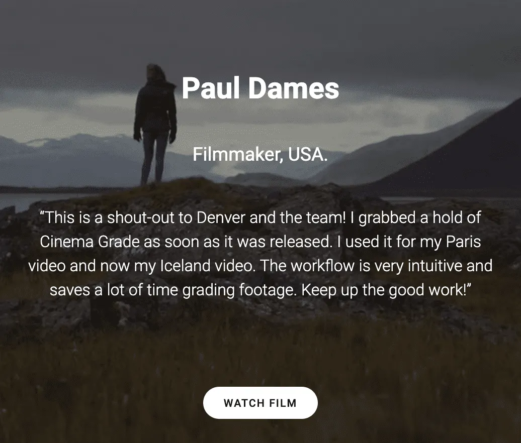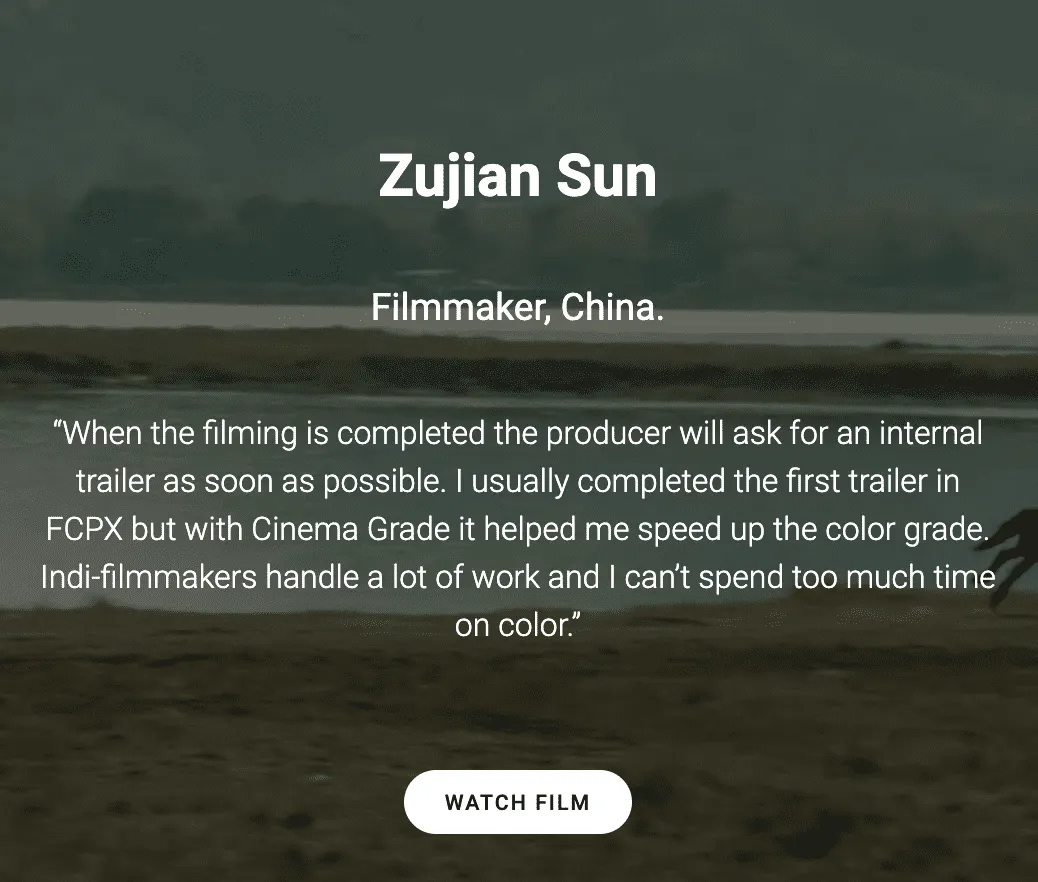Cinema Grade is replacing all my other grading tools! It feels like they have reached into my brain and created a layout that makes complete sense to me. I was able to create amazing grades in minutes, instead of struggling for hours.