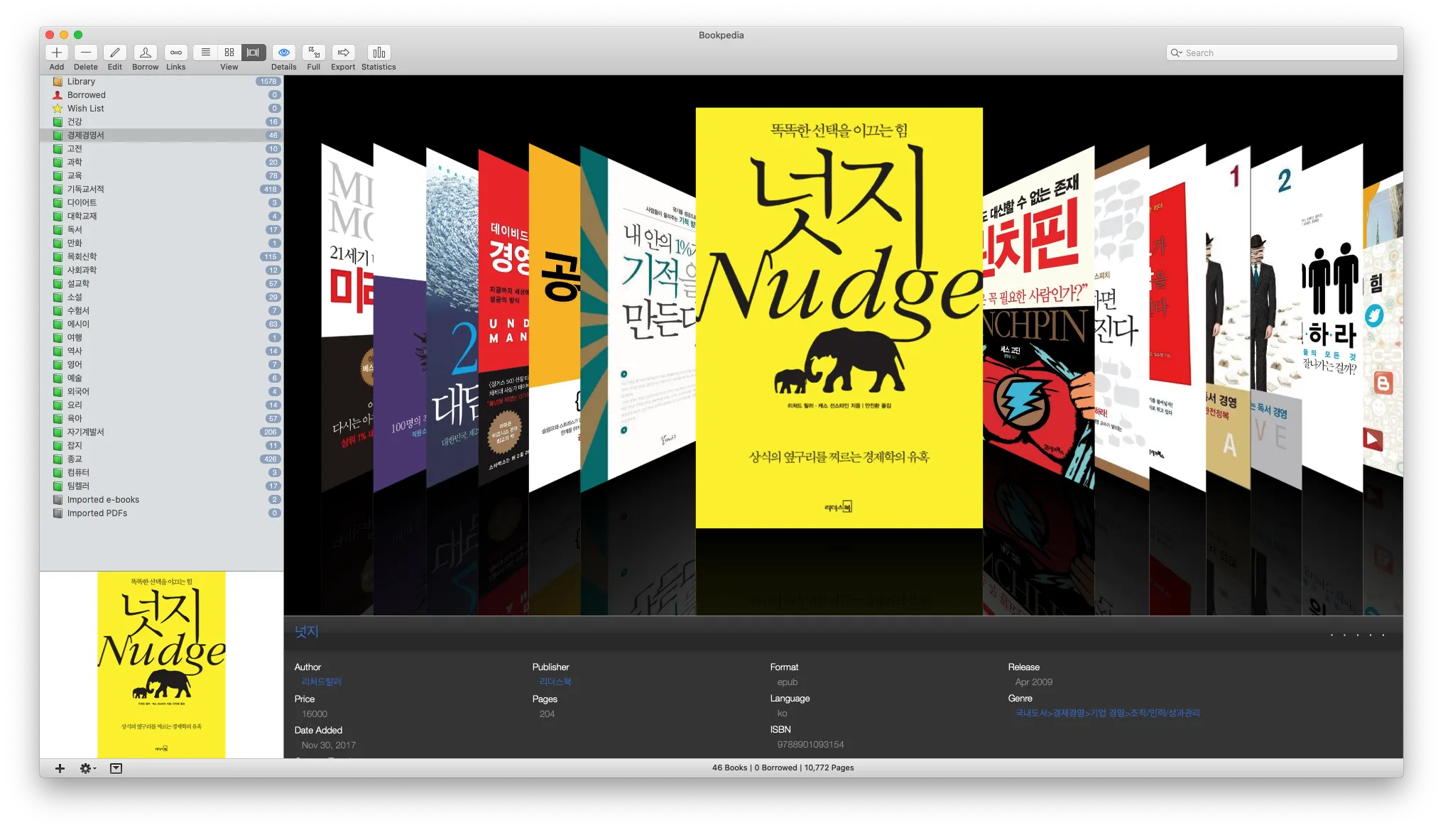 알라딘DB 와의 연동을 통해 책 제목과 매칭시켜 거의 책의 저자, 페이지수, 목차, 카테고리 및 다양한 정보를 내가 가지고 있는 파일과 싱크 시켜준다. 이전에는 책제목.pdf 책제목.epub 나부랭이들이 E-BOOK ASSET (자산)이 되어 실제 하는 책처럼 보여주고 다양한 필터링으로 내가 어떤 저자의 책을 몇권 가지고 있는지 어떤 출판사의 책을 몇권 가지고 있는지 Entire Searching 기능으로 내가 가지고 있는 모든 책의 단어 검색까지 가능하고 "사랑" 이라는 단어를 치면 PDF(OCR)+ePub 파일을 모두 검색하여 사랑이라는 단어가 가장 많은 책이 어떤 책이며 총 몇개의 단어가 들어 있는지도 확인이 가능한 무시무시한 기능을 가지고 있다.
