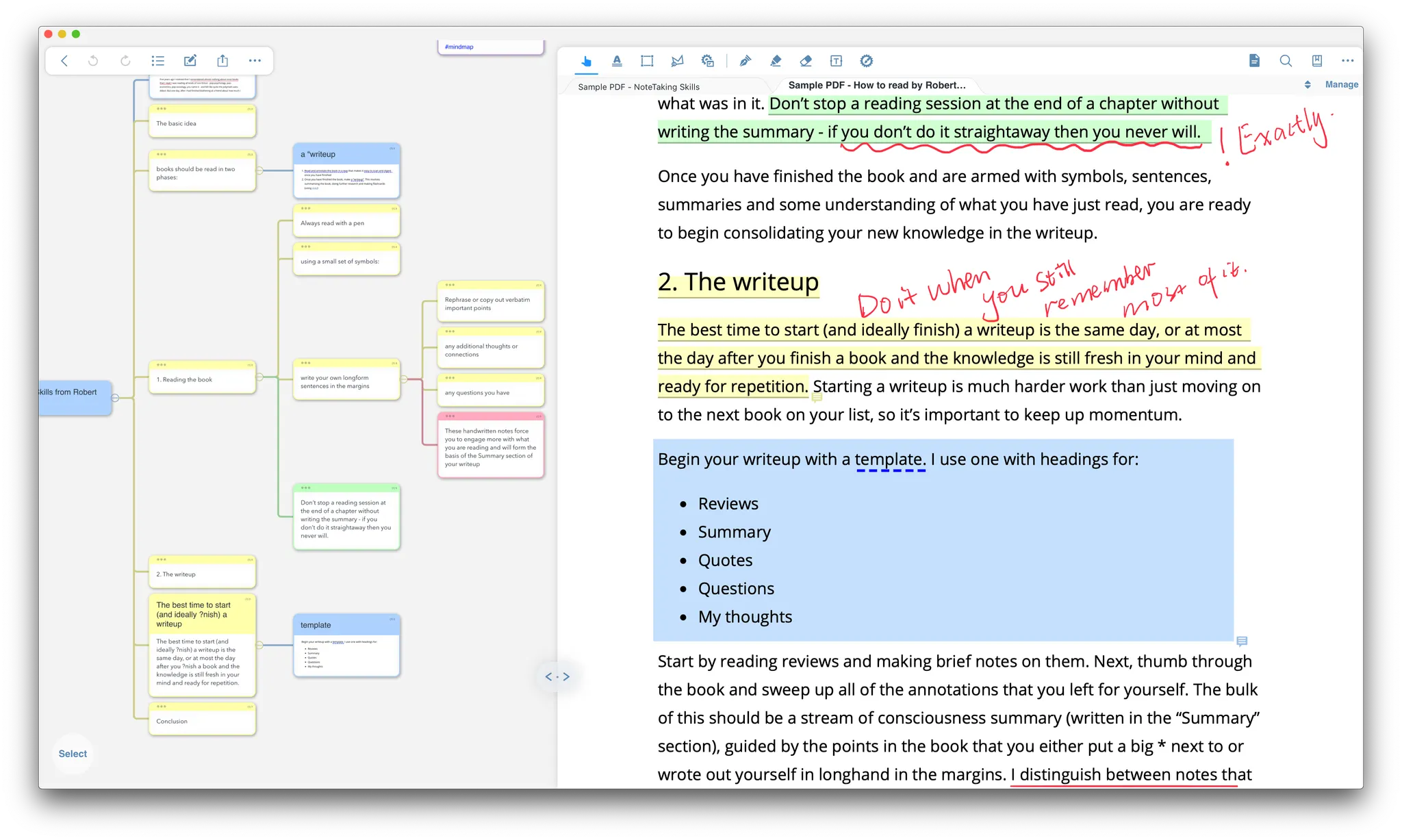 PDF 파일이 OCR 화 되어 있지 않아도 영역을 이미지화 하여 자동으로 요약 페이지가 생성되고 그것을 마인드맵 화 할 수 있다. 그리고 책에 메모를 하듯 여기저기 필기한 내용들도 모두 저장되어 보여 준다.
