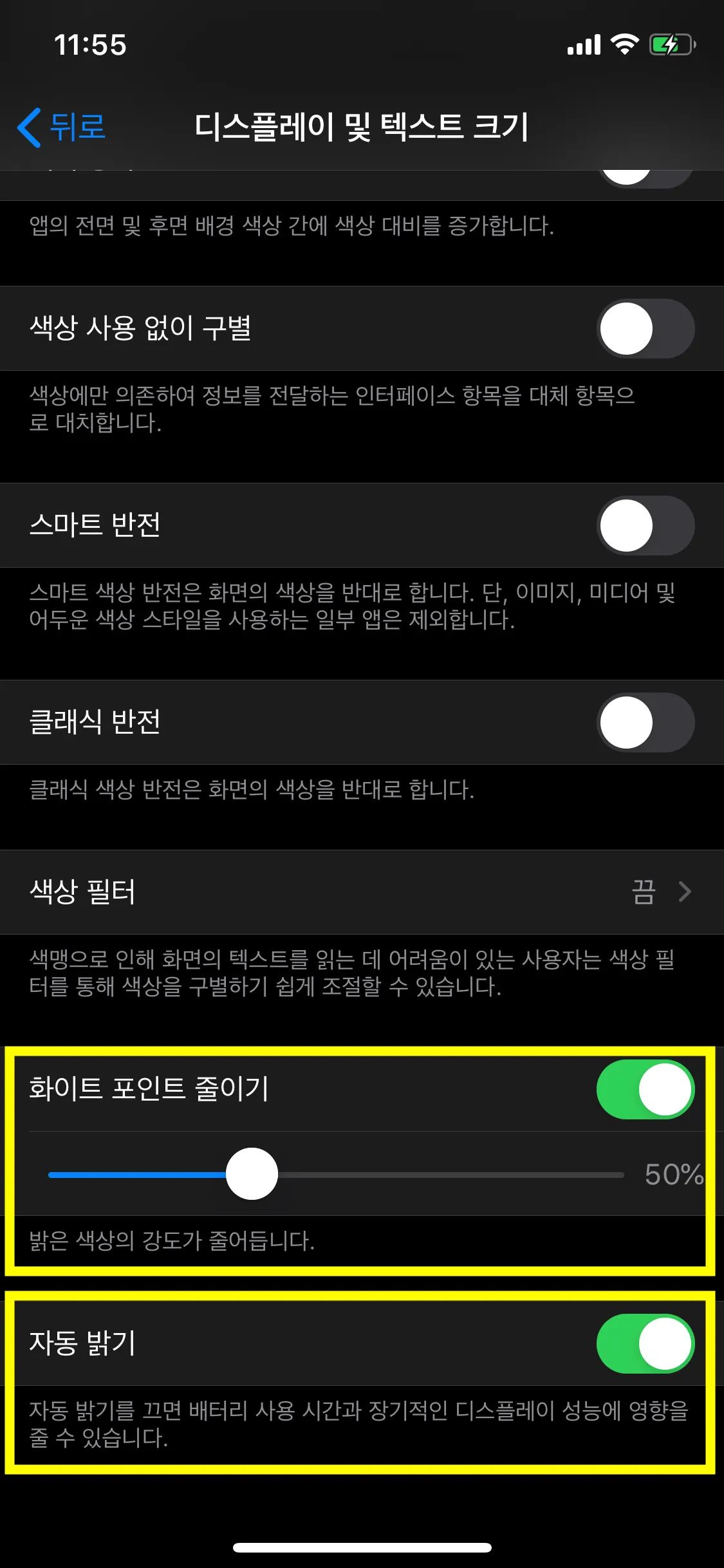아이폰 X 이후로는 OLED 기술이 적용되면서 검정색 화면에서는 LED가 켜지지 않기에 이북을 소비하는데 더욱 편해졌다. 리디북스나 도서앱에서 배경을 블랙으로 설정하고 아이폰의 설정 - 손쉬운사용 - 디스플레이 및 텍스트 크기 에서 화이트 포인트 줄이기를 활성화 해주고 50% 설정한다. 두번째는 바로 아래에 있는 자동밝기를 켜준다. 이렇게 하면 이전 보다 텍스트 가독성도 높아지고 눈의 피로를 조금이나마 줄여줄 수 있다.