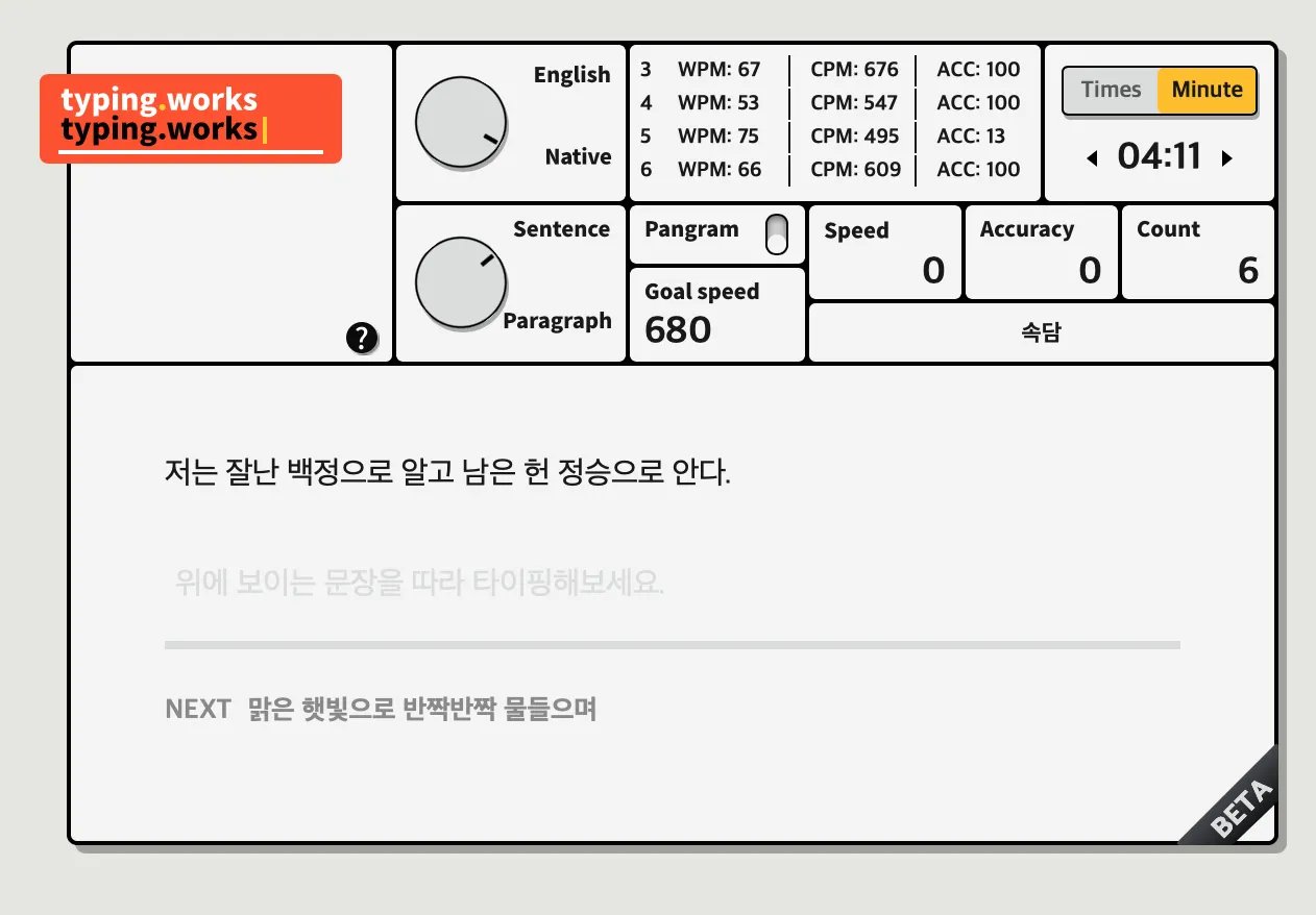 한글과 영문 모두 지원하며 몇분 동안 타이핑을 할지 정할 수 있고