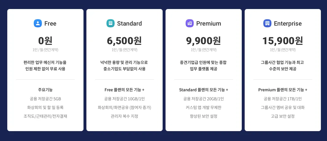 일단은 잔디는 비영리 단체 할인이 되고 있는데 카카오는 어떨지 개인적으로 궁금하네요. 잔디는 프리미엄이 1일당 5천원인데 비해 카카오워크는 스텐다드가 1,500원 더 비싼 6,500원인데요.