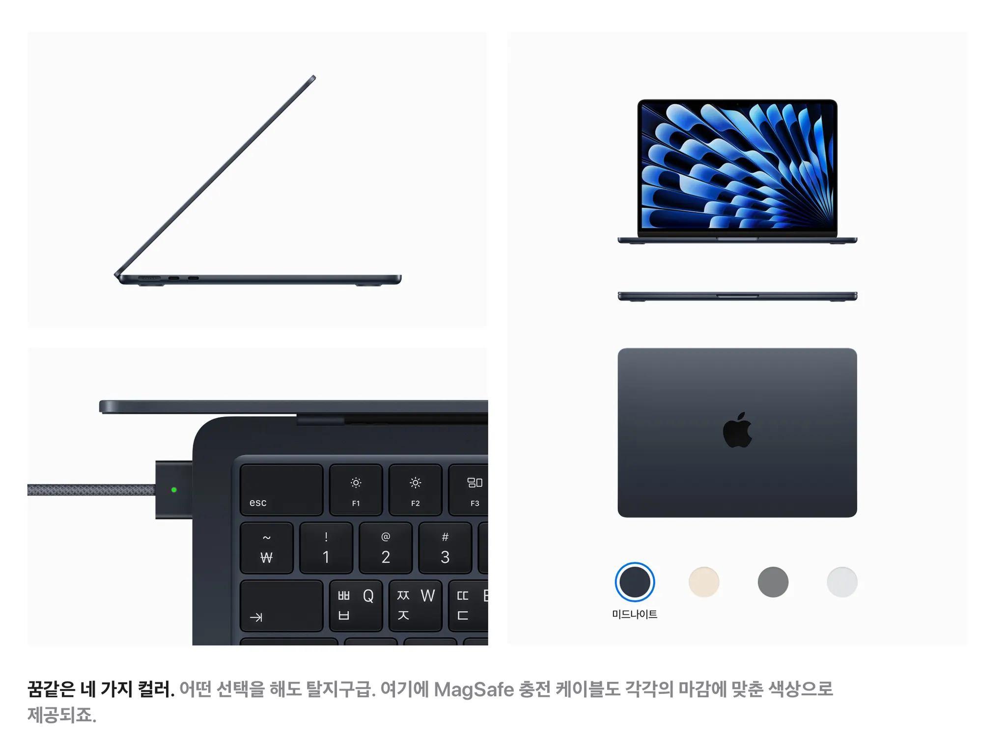 맥북에어 15인치는 존재하지 않았던 라인업이고 실리콘 프로세스 탑재한 맥북에어의 3번째 디바이스로 출시가 된것이다. 첫 모델이지만 첫 모델이 아니다. 거두절미하고 그렇게 예쁘고 강력하고 오래가는 이 기기의 가격은 190만 원대 인다.