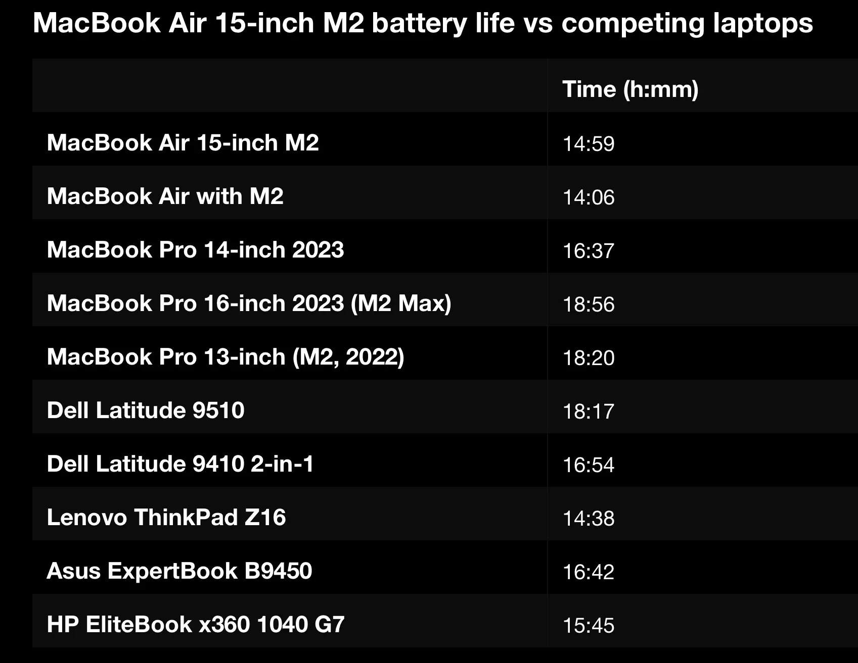 보시는 것 같이 맥북에어 M2 15인치는 최고의 베터리 타임을 가진 제품은 아니다. 하지만 15시간은 사실상 충분한 베터리 타임이다. 그리고 윈도우 랩탑에서 프로세싱 파워를 어떻게 사용하는지에 따라 베터리 시간이 기하급수적으로 줄어들기 때문에 사실상 실리콘 기반의 맥북의 베터리 타임과는 단순 비교가 불가능하다.
