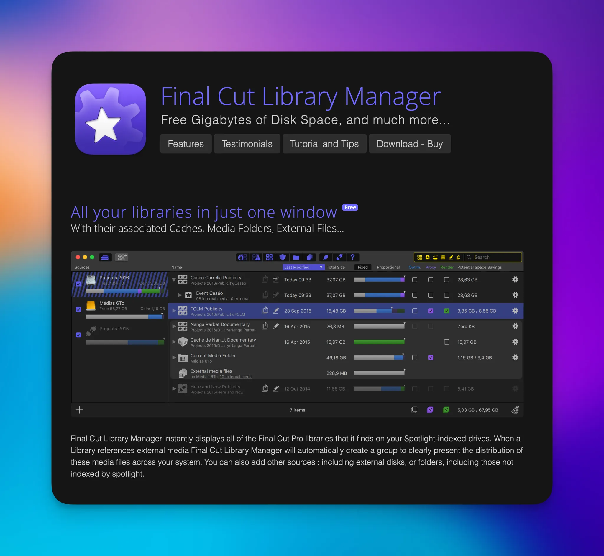 파이널컷프로 에서 영상편집을 하다보면 라이브러리의 용량으로 부터 압박을 받게 된다. 이를 해결하기 위해 라이브러리 관리에 대한 지식이 필요하고 각 라이브러리 관리를 실패하게 되면 중요한 순간에 용량으로 인해서 촬영 소스 혹은 편집퍼포먼스 하락, 맥 용량 관리에 실패 함으로 영상편집에 어려움을 겪게 된다. 이번 포스팅에서는 파이널컷프로의 라이브러리를 도와줄 앱을 소개하고 사용법을 알아보도록 한다.